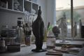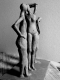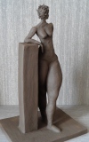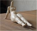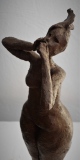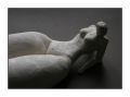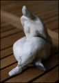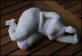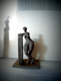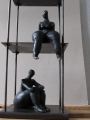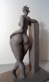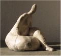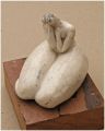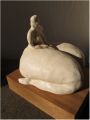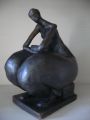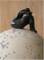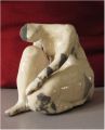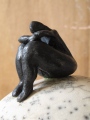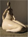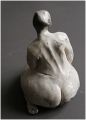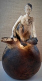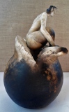 • Femme assise sur boule blanche, terre enfumée, émaillage Raku.